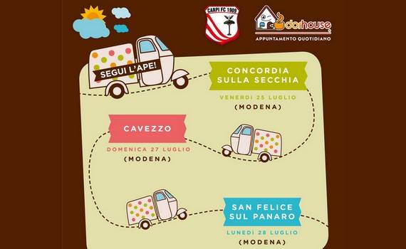 Dopo le tappe di Concordia, Cavezzo e San Felice sul Panaro, sabato 2 agosto l’ape di Dorhouse arriva in piazza Martiri a Carpi! Dalle 9 alle 13, presso il simpatico mezzo a pois troverete ad attendervi non solo un buon caffè ma anche tutte le info per abbonarsi al campionato 2014-15 del Carpi e essere sempre più #fierideinostricolori