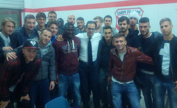 Il Direttore Generale della Lega Serie B Paolo Bedin ha fatto visita al Carpi e incontrato i calciatori biancorossi, ai quali il dirigente ha tenuto un seminario formativo sulla figura del calciatore moderno e sul funzionamento e la composizione della Lega Serie B. Nella foto, il Dg Bedin con i biancorossi.